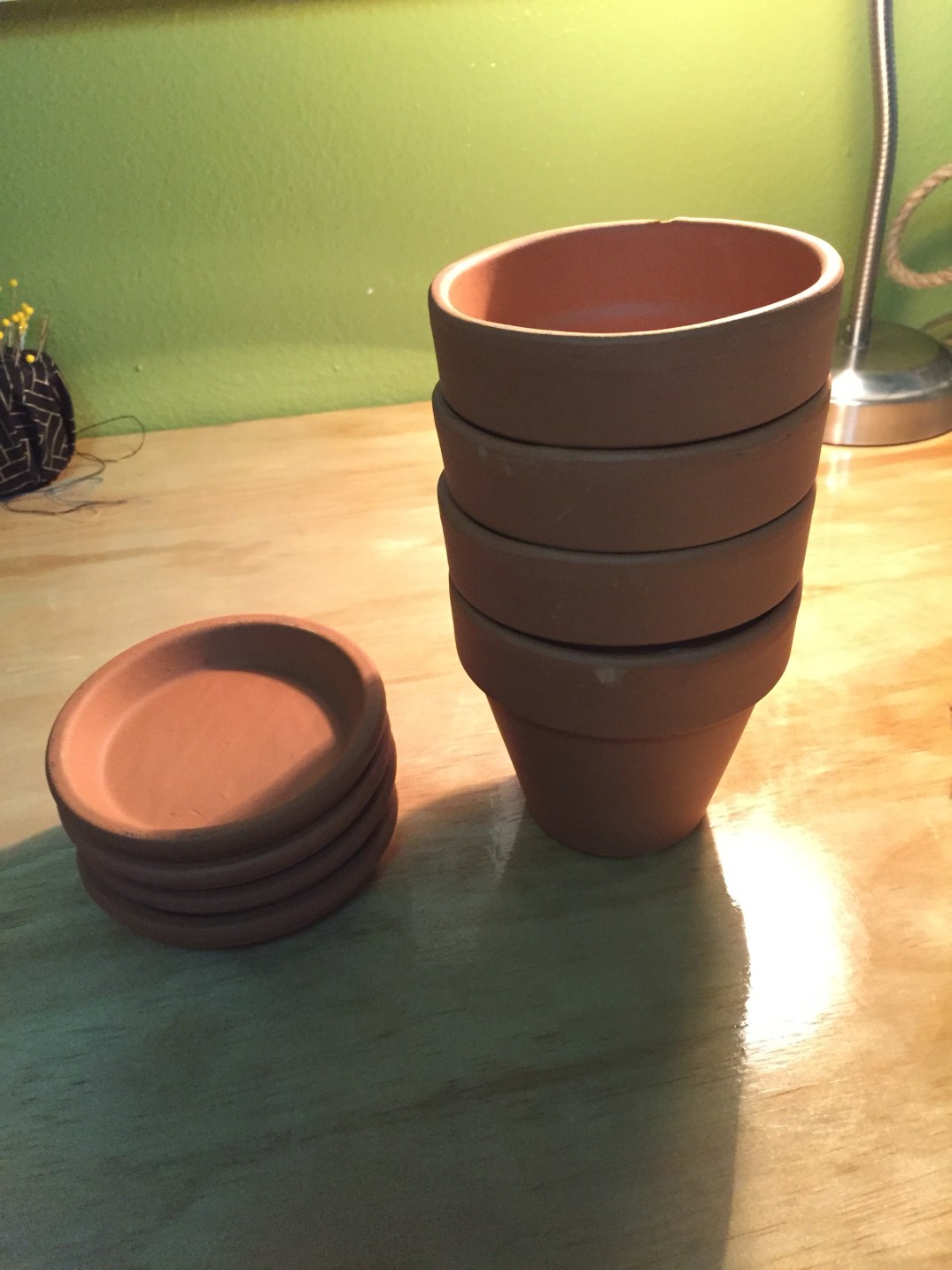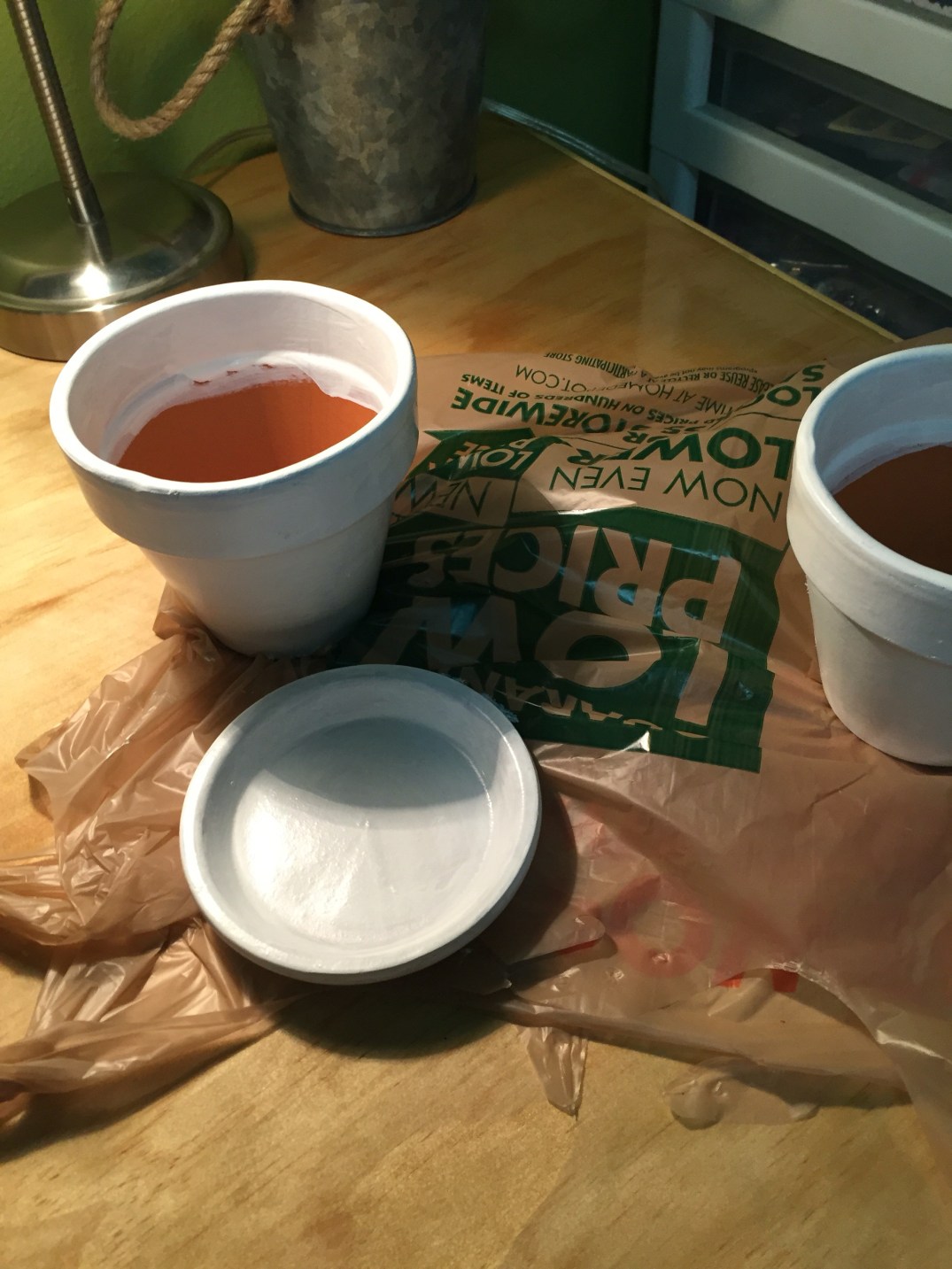 For the spring ones, I first mixed a little grout with some white paint and did a base coat. This gave them some great texture. Then I painted them with paint mixed with a little water to do a more washed look. They are so cheerful, they make me a little sick.